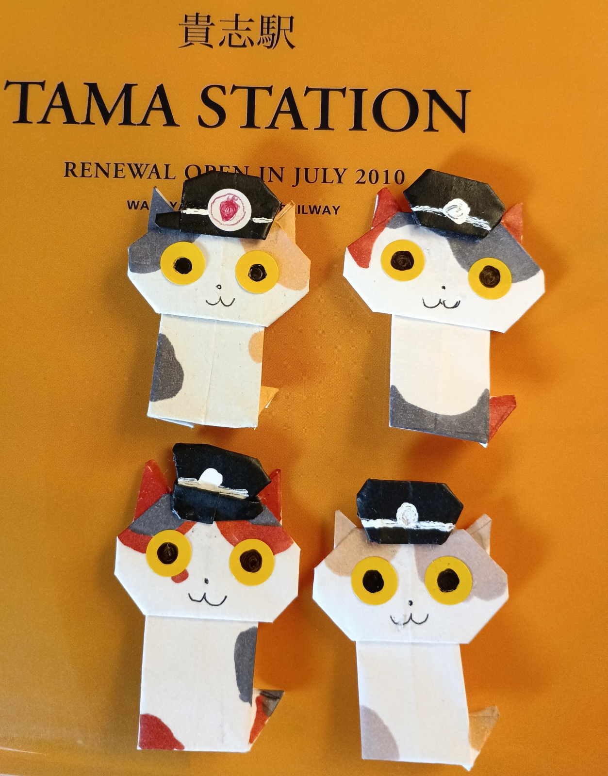 猫駅長の折り紙 好きが嵩じて折り紙で作ってしまいました。左上が貴志駅の初代猫駅長たま様右上が現貴志駅長よんたま様左下が現伊太祁曽駅長のごたま様右下が昨年11月に永眠されたニタマ駅長作ったときは「なかなかいい出来だわ…」なんて悦に入ってたんだけどいざ写真でアップすると地味だわね…改良の余地まだまだアリだわ